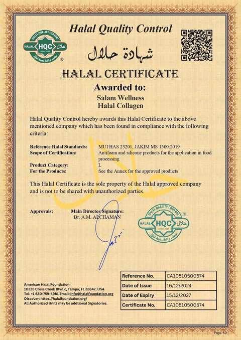 Salam Wellness offers the first halal-certified collagen protein specifically designed for Muslims, sourced from grass-fed, non-GMO beef and certified by the American Halal Foundation and the Halal Monitoring Authority in Canada. This ensures the highest quality, pure ingredients, fully compliant with your faith and lifestyle.